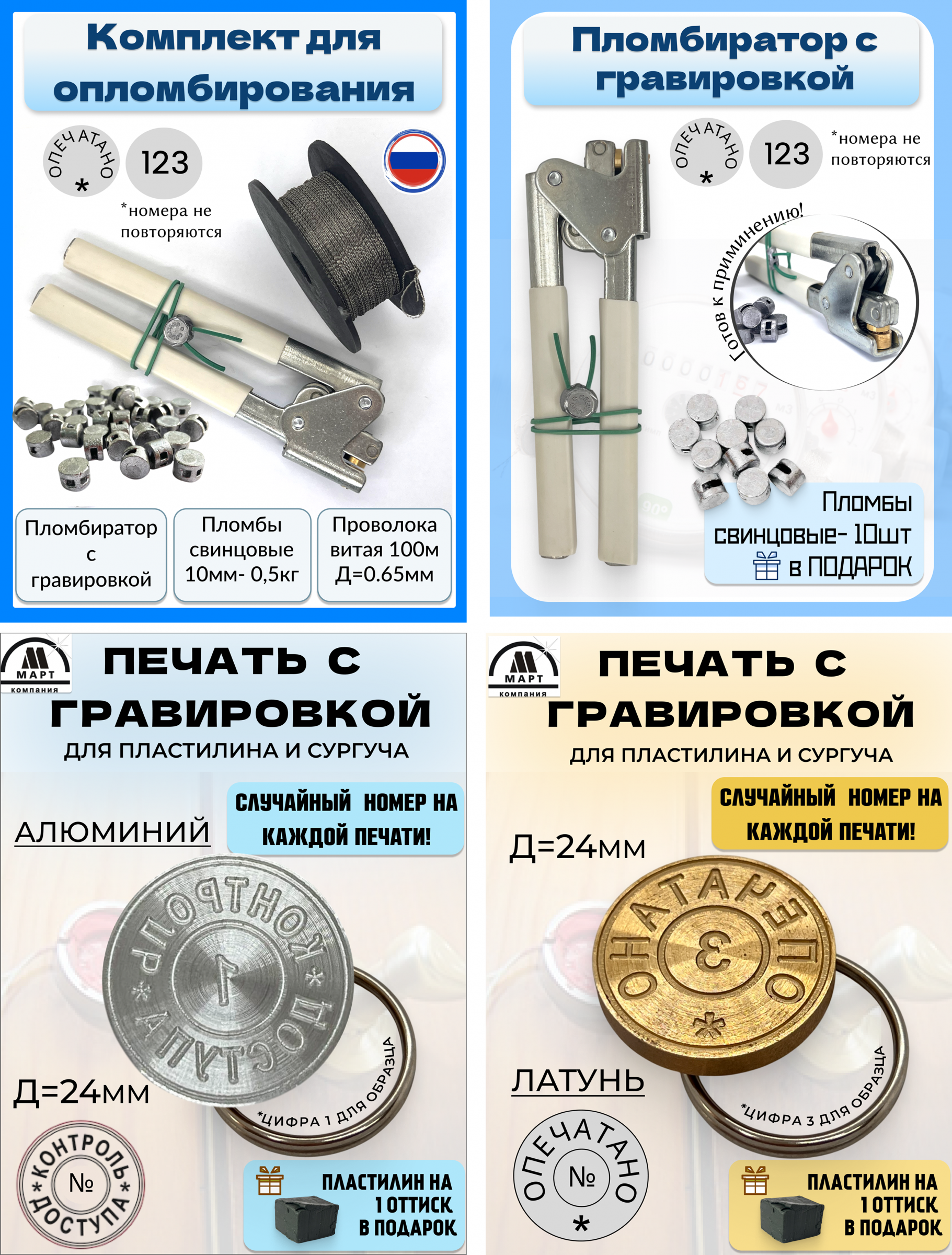 Предлагаем Вашему вниманию готовые наборы для опечатывания, а также пломбиры алюминий и латунь со стандартной гравировкой (без выбора номера)